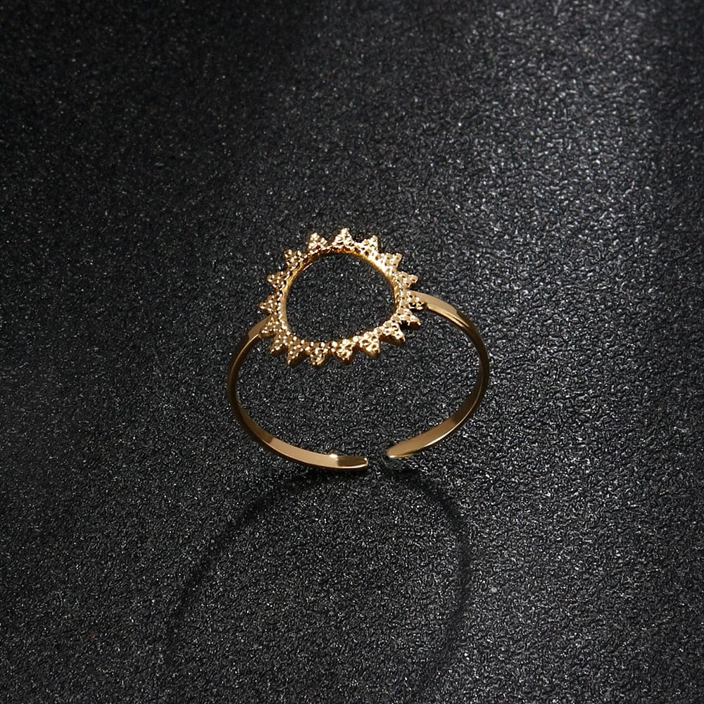 An intricately carved ring n the shape of a sunburst. Strikingly beautiful. this statement piece is made with a cut-out center and fine lines that resemble sun rays. Wear this Gold Sun Statement Ring together or stacked separately.