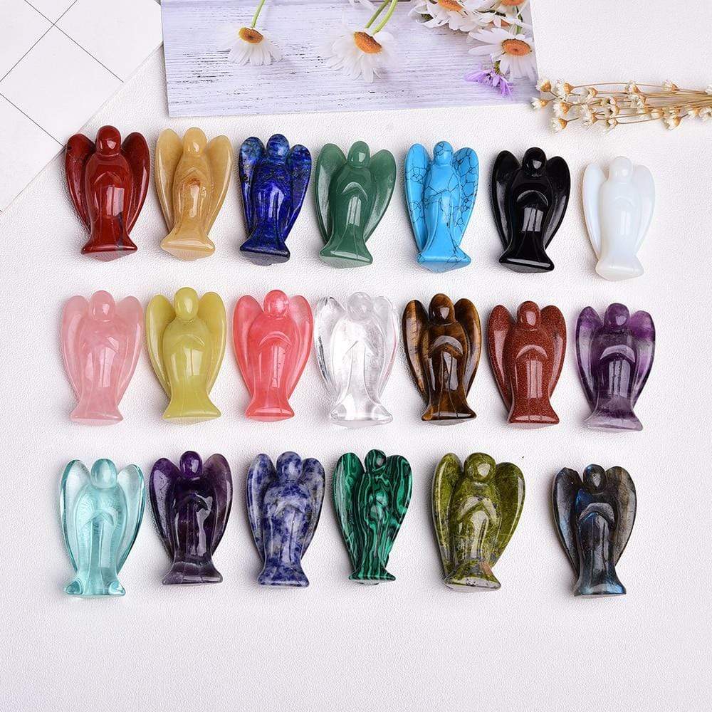 Beautiful hand carved 2 inches guardian angel crystal figurine in Amethyst. Aventurine quartz. Blue turquoise. Blue-vein stone. Clear quartz. Green olive jade. Labrador feldspar. Lapis lazuli. Malachite. Obsidian. Opal. Purple fluorite. Red sandstone. Red smelting. Red jasper. Rose quartz. Tiger eye. Unakite. Yellow jade.