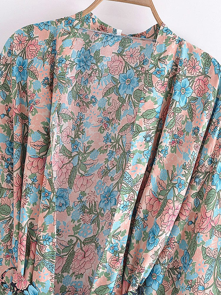 This airy kimono is made of cotton and rayon fabric and has a boho-inspired floral motif. as well as a removable tie. and boxy dropped sleeves.