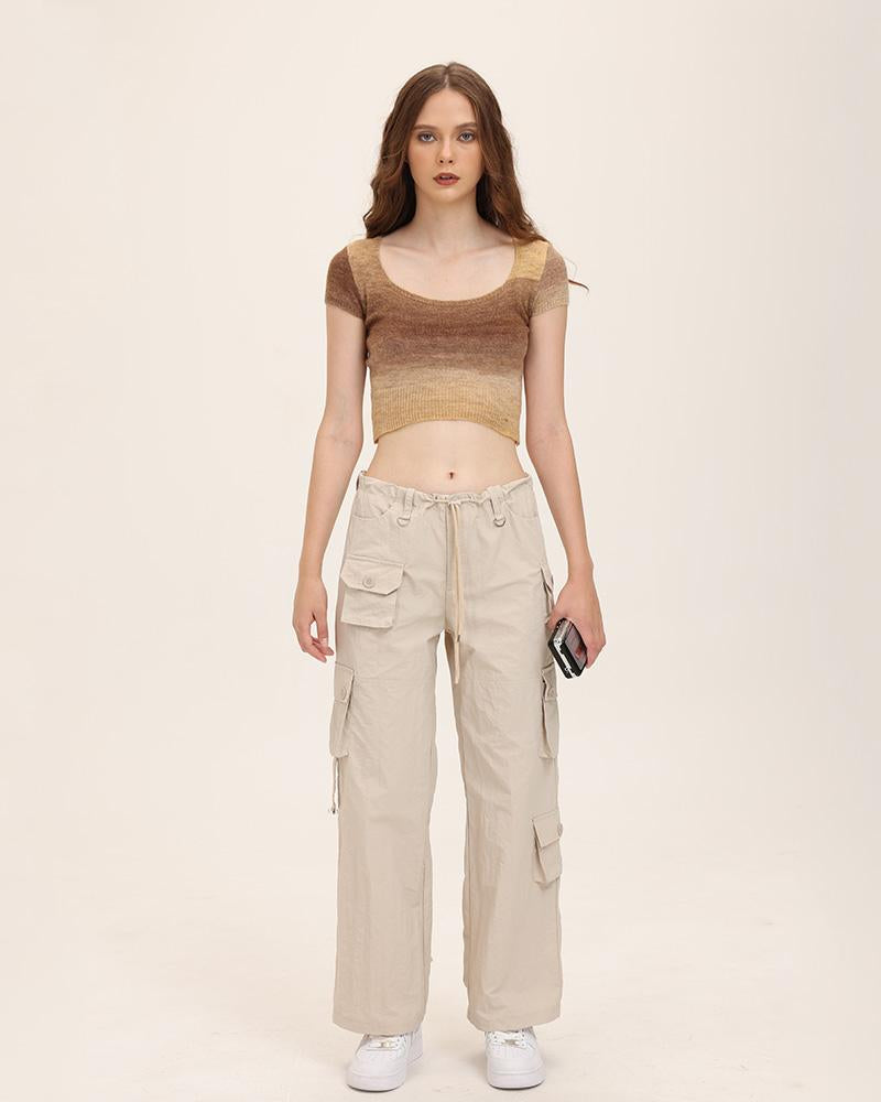 Details: Long khaki cargo pants with drawstring details and multiple pockets design