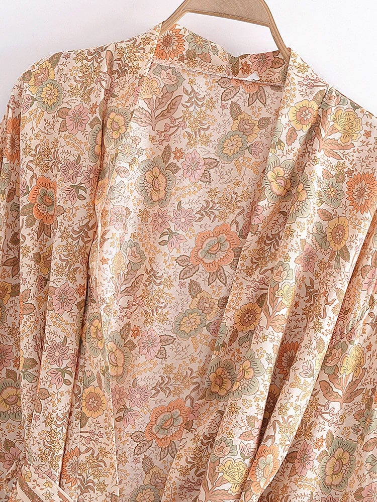 This kimono is excellent for the beach and beyond. with its classic longline silhouette. open front. floral print. and a tie-up waist.