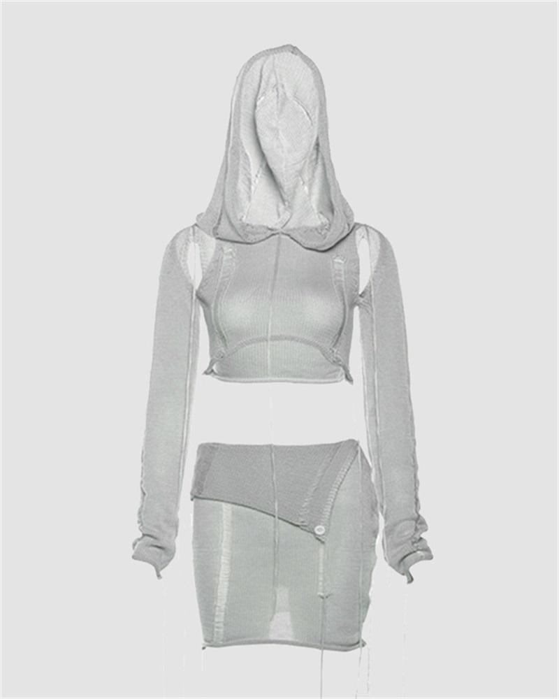 Details: Crochet coord set with long-sleeve hoodie top and mini skirt