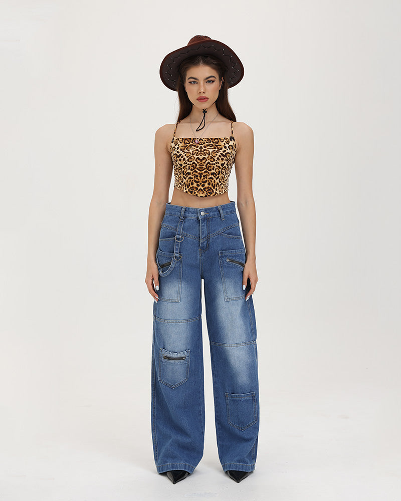 Details: Denim blue jeans with front pockets design and side belt