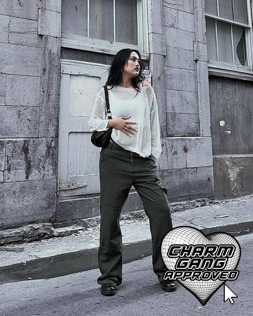 Details: Long-sleeve crochet sweater with see-throughdesign