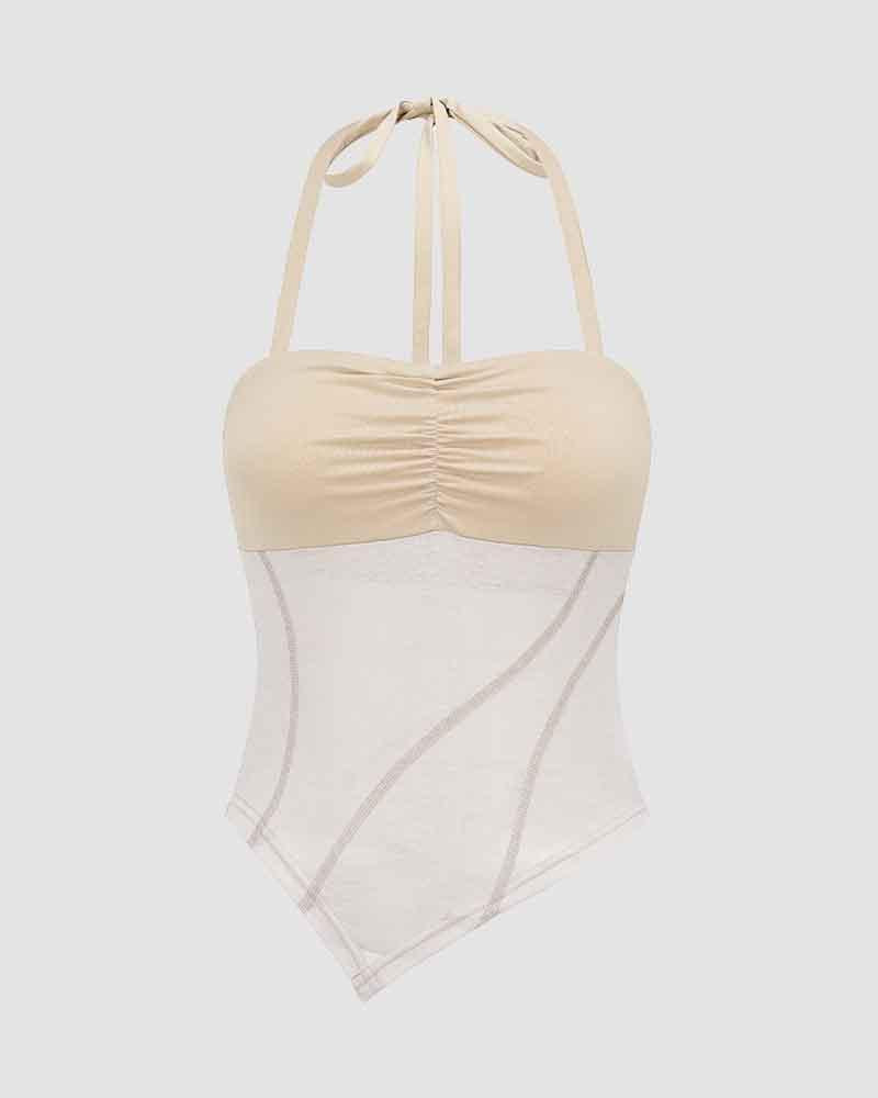 Details: Handkerchief halter top with matching khaki color design