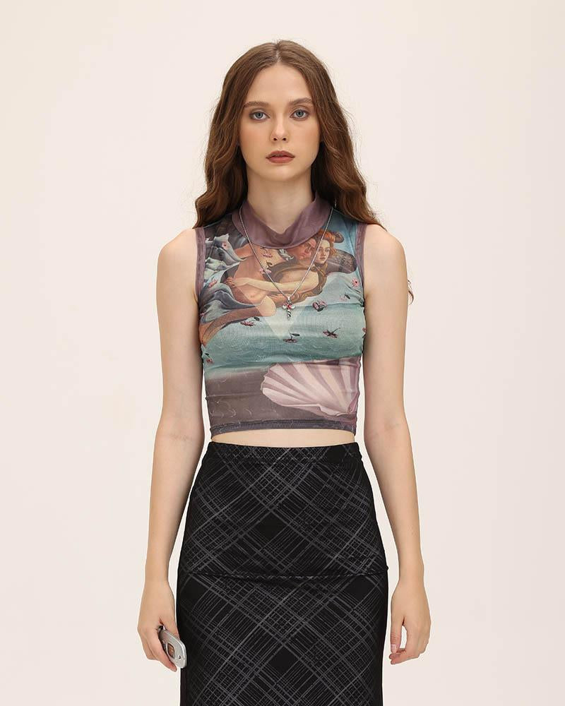 Details: Mesh tank top with artistic graphical print