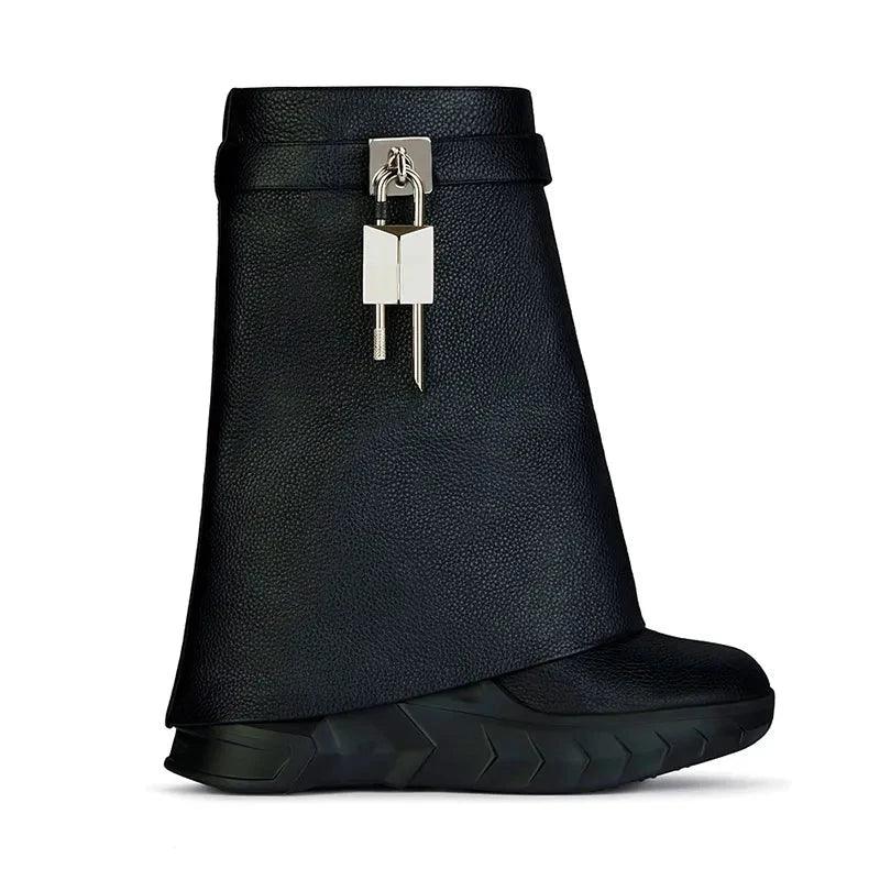"Step into luxury with Women's Mid-Calf Boots. Perfect for Kentucky Derby 2024. Cavs vibes. and Kendrick Lamar beats. Crafted with genuine cow leather shaft and upper for durability. PU insole and wedge heels for comfort. Metal decoration adds flair. Round toe and solid pattern for timeless style. Zip closure for ease. Elevate your fashion with British style."