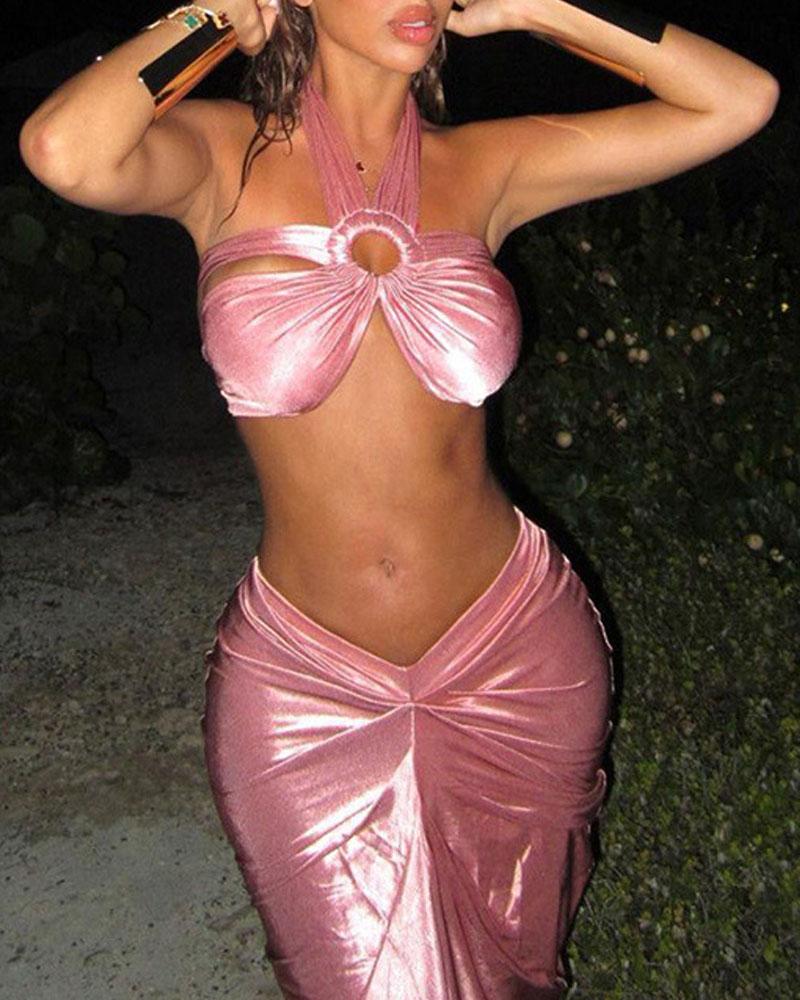 Details: Pink coord set with satin fabric. coming with halter bralet and maxi skirt