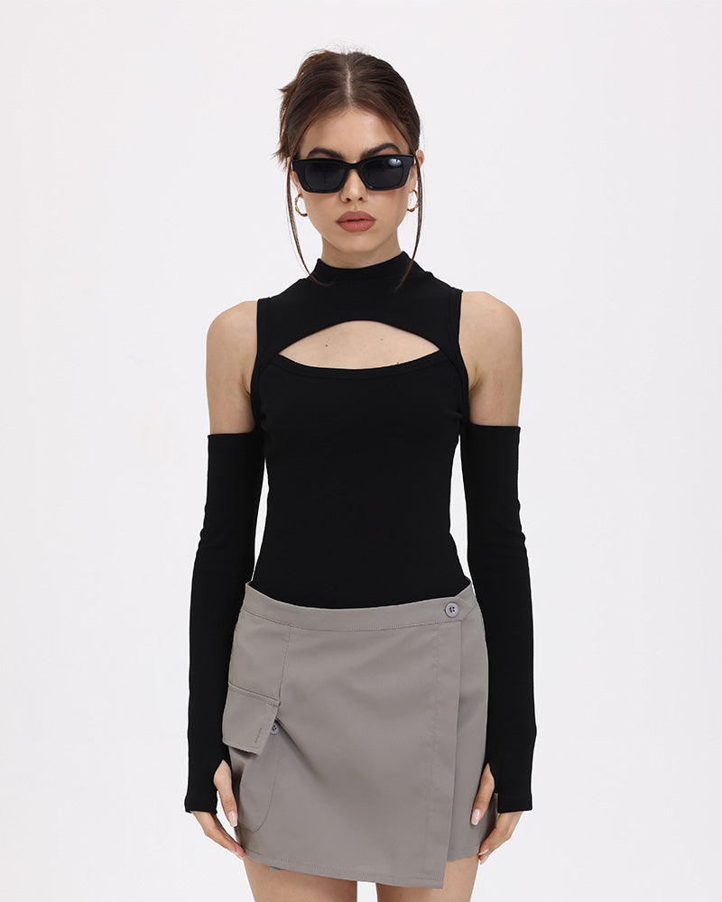 Details: Long-sleeve bodysuit with shoulder and chest cut-out details