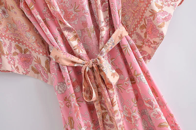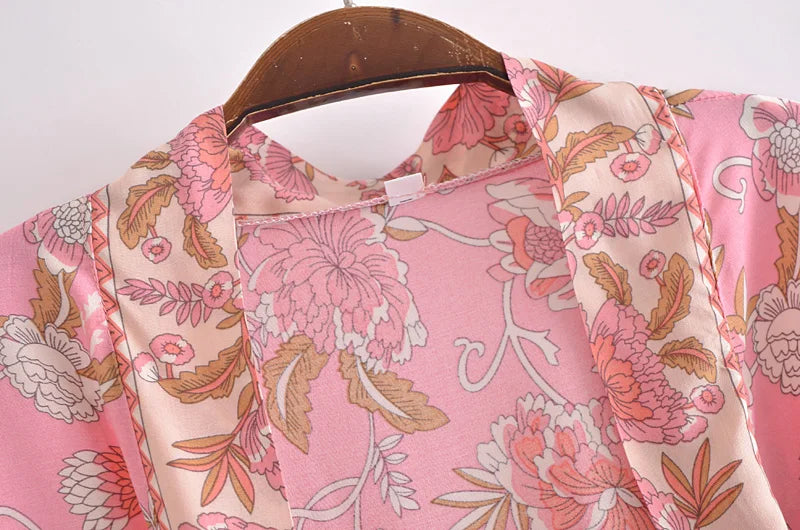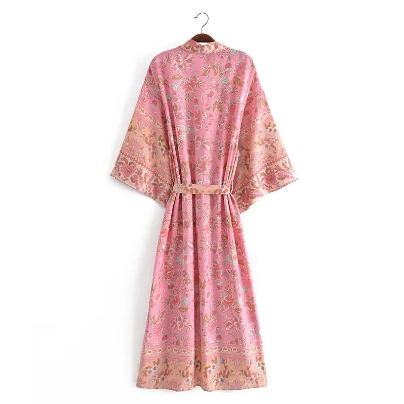 Step into a world of soft serenity with the Meiko Floral Kimono Robe. your new favorite piece for unwinding in style. This robe blooms with a delicate floral pattern in shades of blushing pink and subtle earth tones. creating a look that's both feminine and grounded. The lightweight fabric flows effortlessly. while the wide sleeves and knee-length cut offer a comfortable. airy feel. Cinch it at the waist with the matching tie for a flattering silhouette. or leave it open over a simple tank and jeans for a breezy. boho vibe.