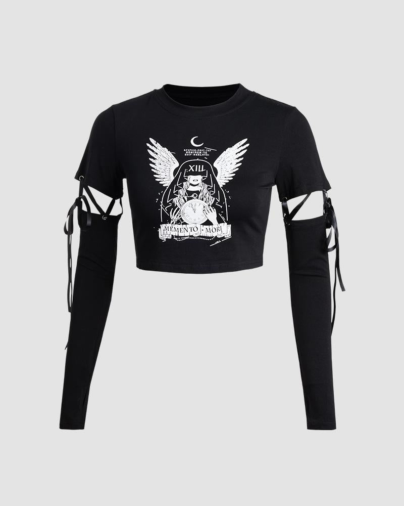 Details:Black T-shirt with dark psychic graphical print and connected long sleeves