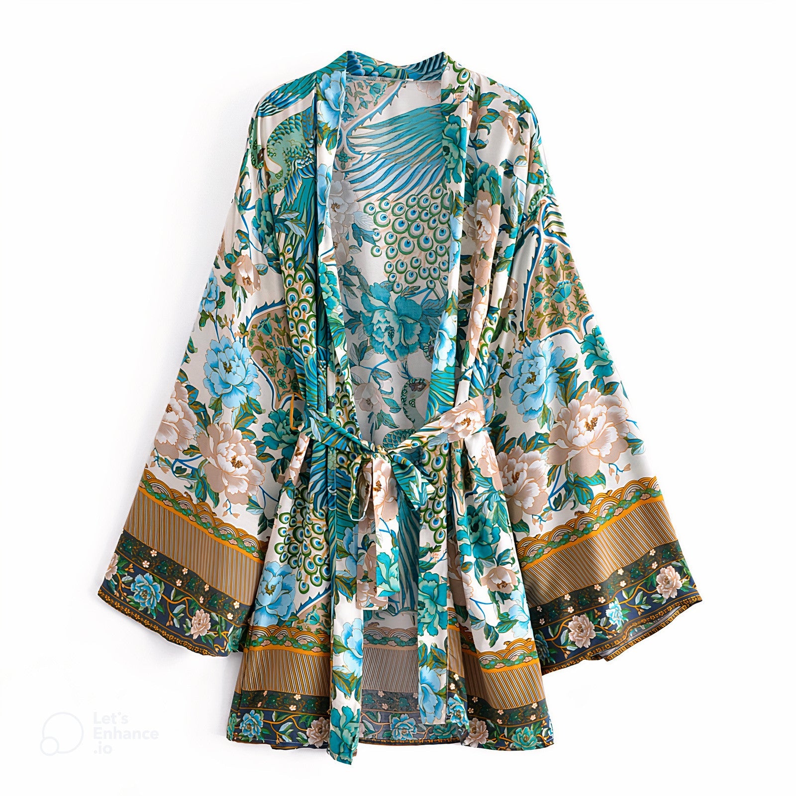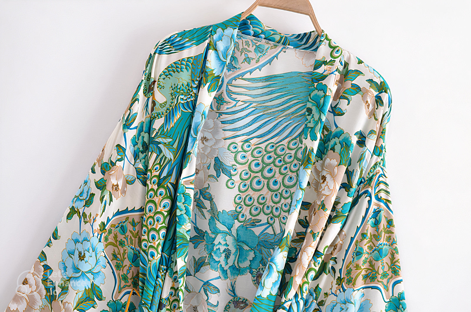 The Naya Floral Kimono Robe exudes a serene elegance with its lush floral patterns set against a soft. pastel backdrop. perfect for adding a touch of sophistication to any loungewear ensemble. Its flowing silhouette and waist-cinching tie offer both comfort and a flattering fit. making it a versatile choice for a cozy evening at home or as a chic layer over a simple dress for a bohemian-inspired daytime look. Luxurious yet lightweight. this kimono robe is an effortless statement piece that invites a graceful femininity to your wardrobe.