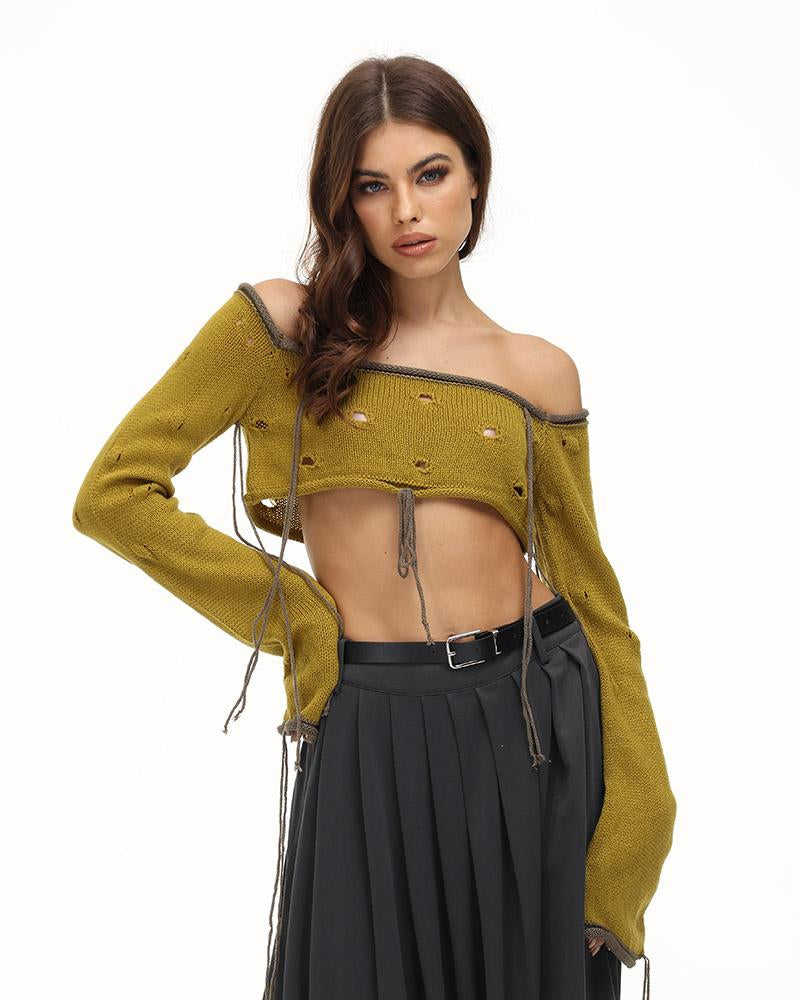 Details: Long-sleeve cropped bolero. with ripped-off design