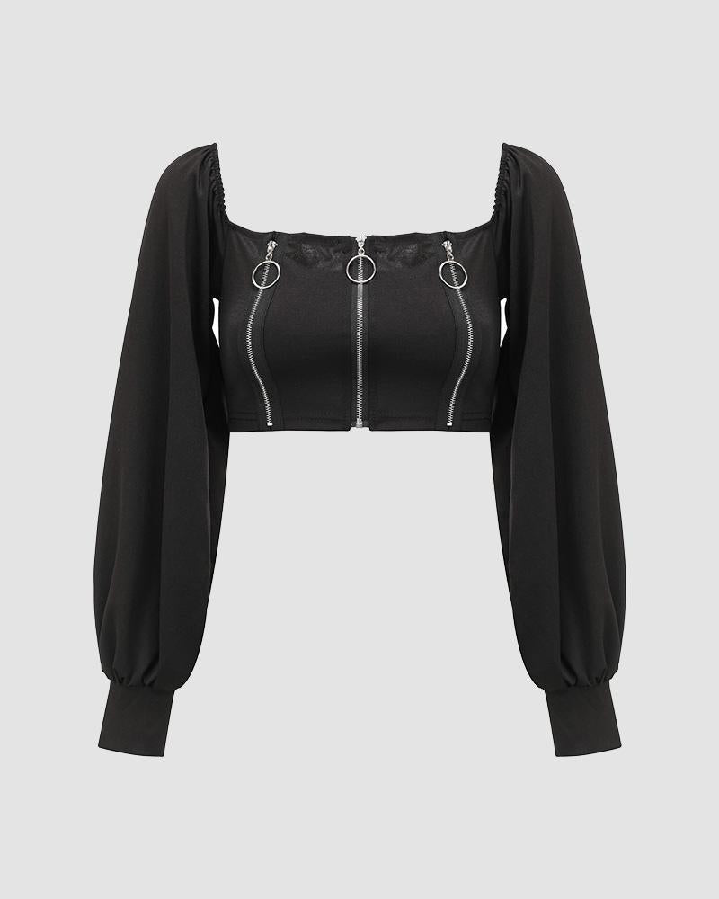 Details: Long-sleeve cropped jacket with front zip design