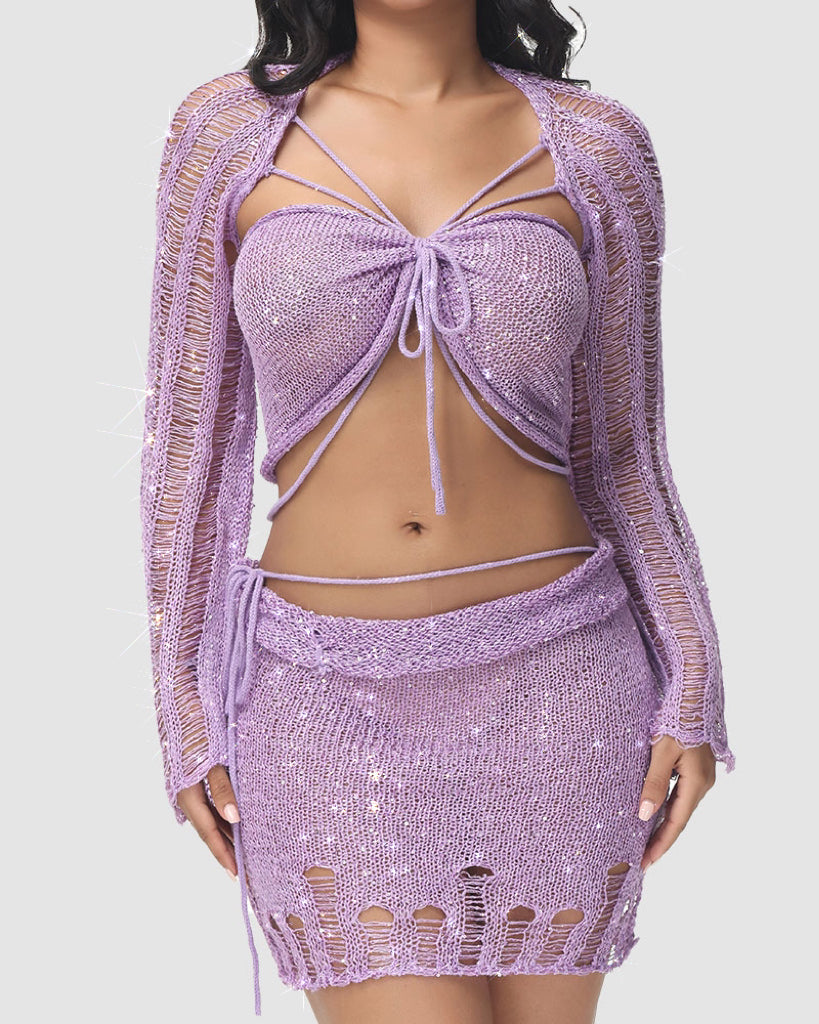 Details: Glimmering coord set with see-through effect. coming with bralet and long sleeves. as well as short skirt