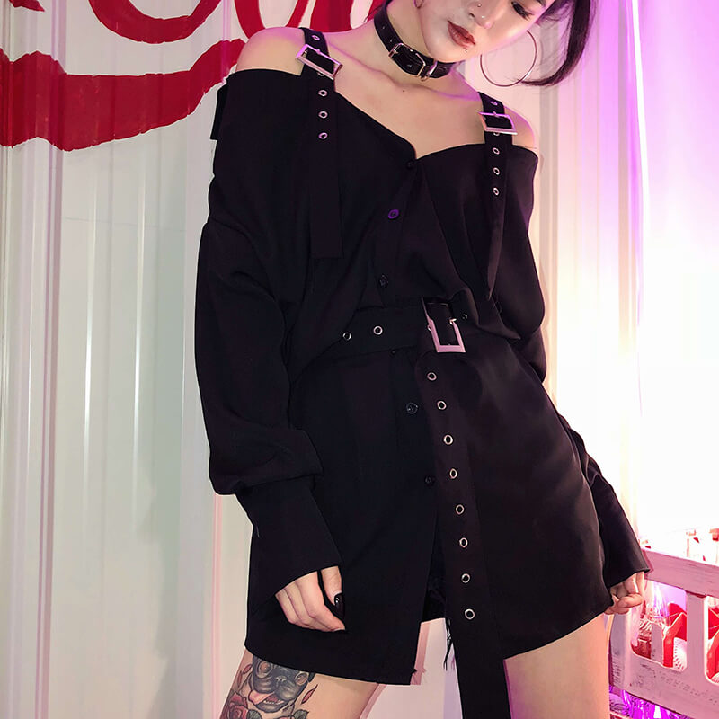 Button front. long sleeve. drop shoulder. high waist. ruched waist. shirt dress