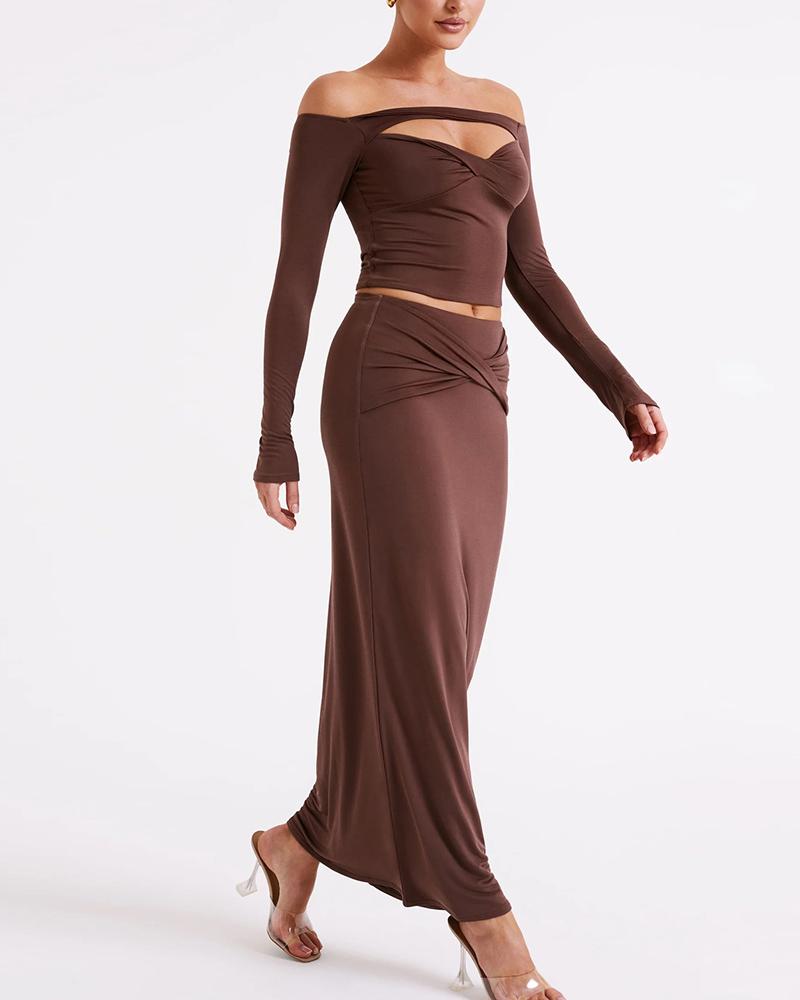 Details: Coord set with solid color design. coming with off-shoulder top and maxi skirt