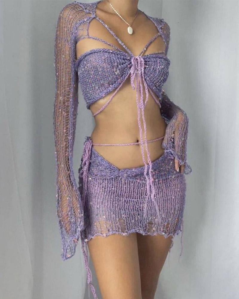Details: Glimmering coord set with see-through effect. coming with bralet and long sleeves. as well as short skirt