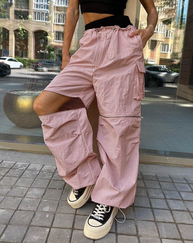 Details: Pink cargo pants with parachute fabric and drawstring design
