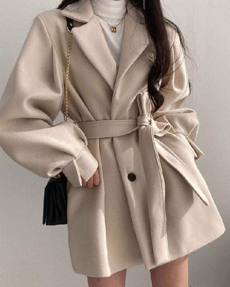 Puff Sleeve Belted Woolen Coat