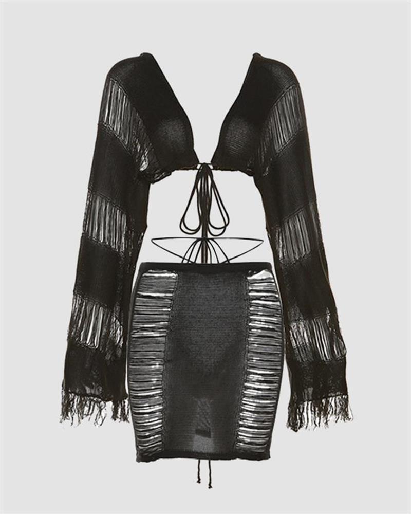 Details: Crochet coord set with rip-off design. coming with long-sleeve top and short skirt