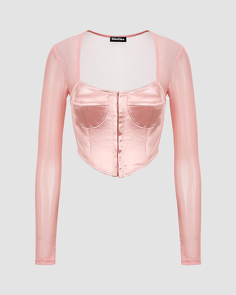 Details: Long-sleeve top with mesh sleeves and satin corset design