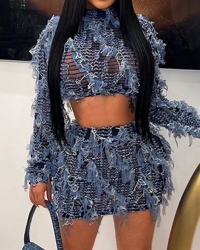 Details: Coord set with mesh ruffle design. coming with long-sleeve top and mini skirt