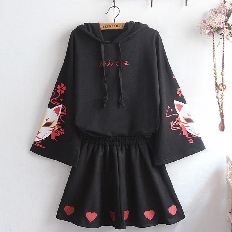 Japanese and fox mask print . long sleeve . drawstring . pullover hoodie