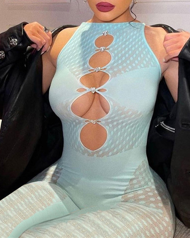 Details: Sleeveless jumpsuit with cut-out holes design and see-through details