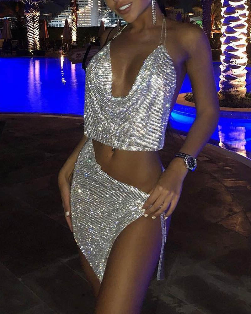 Details: Coord set with shinning details. coming with bralet and short skirt