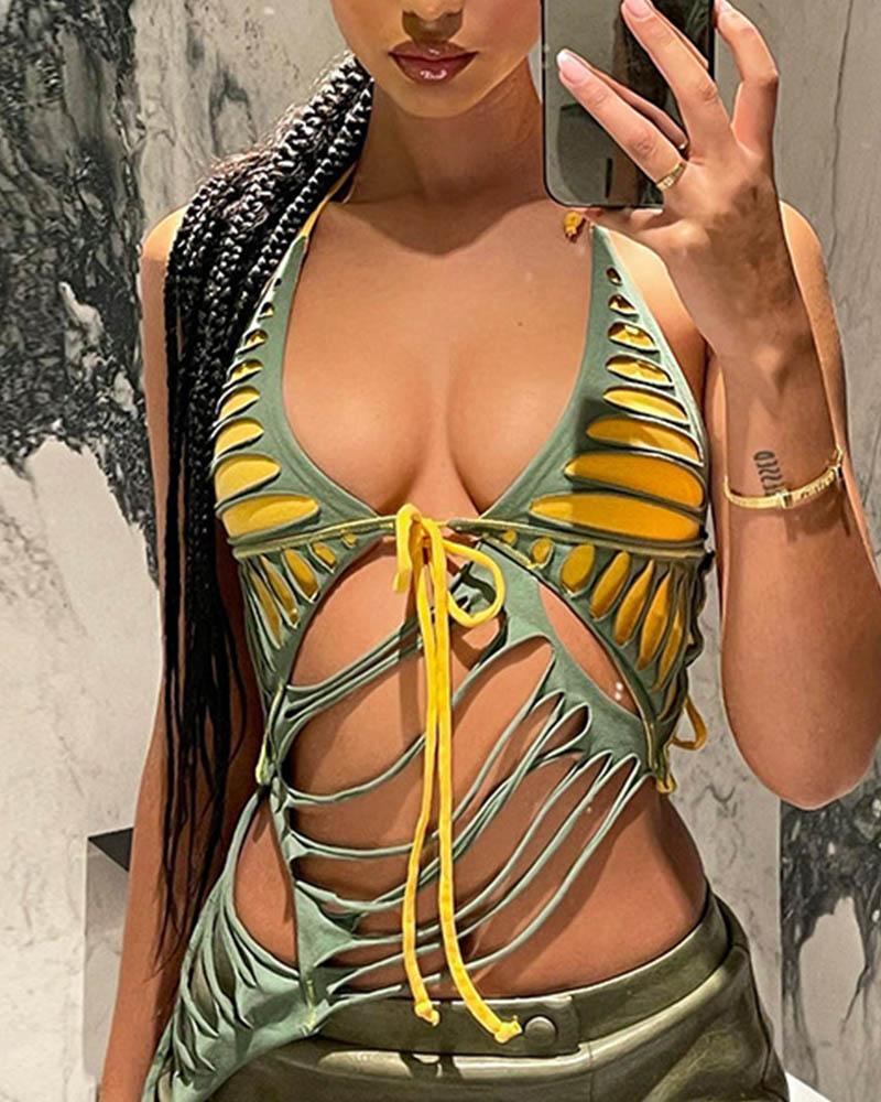 Details: Halter top with rip-off details and stripes design