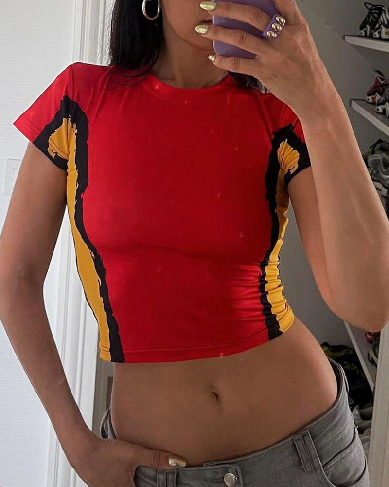 Details: Short-sleeve T-shirt with yellow and red matching color design