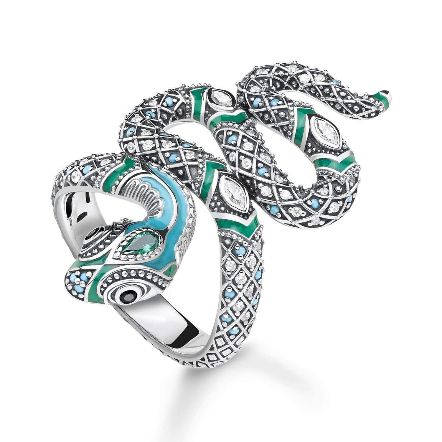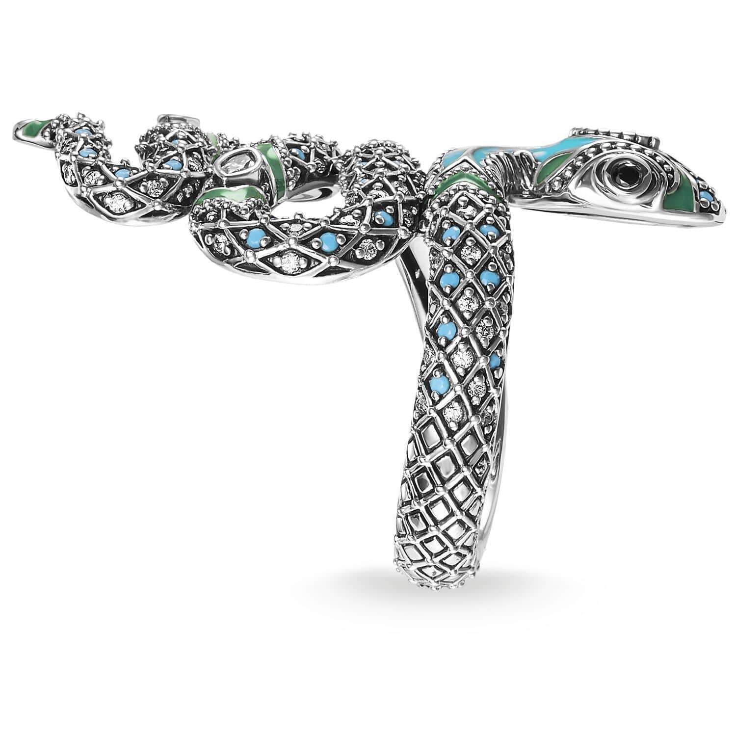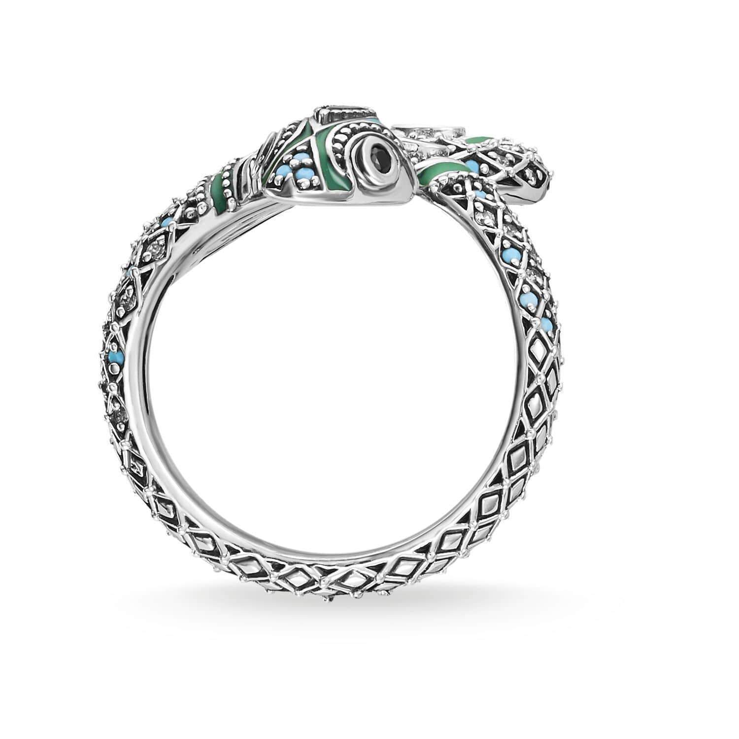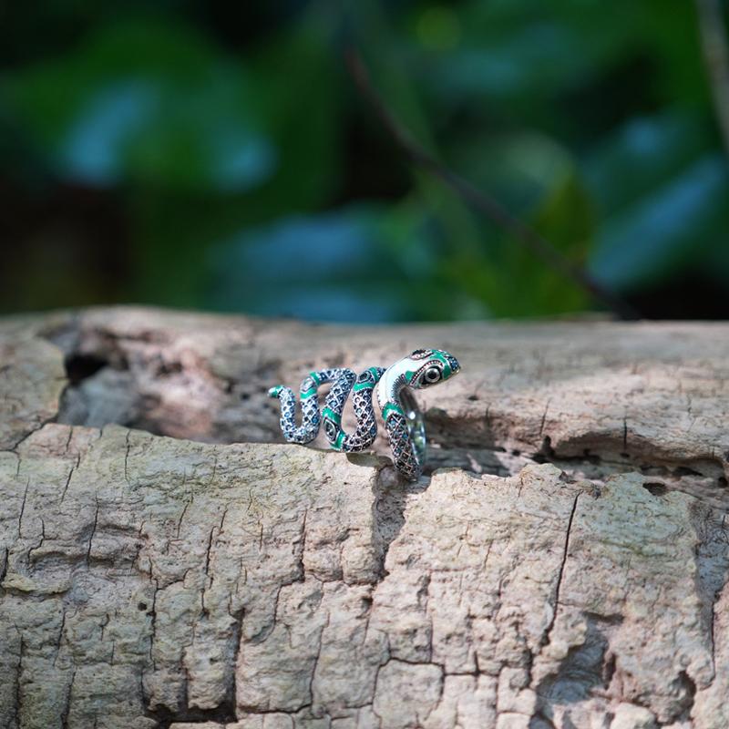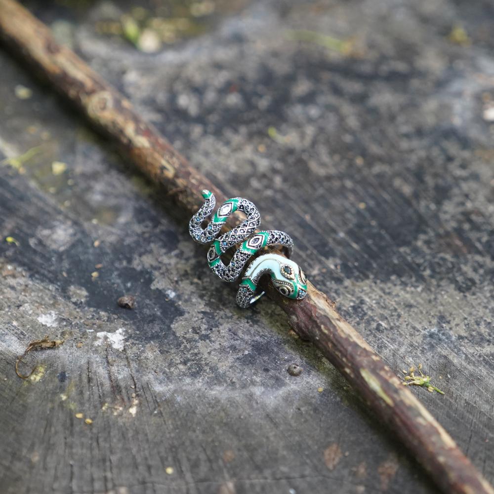 About: The myth of the jungle. transformed into a richly decorated statement jewelry item: Filigree stones set by hand and applied cold enamel enhance the intense effect of the fascinating snake ring in an interplay of green and turquoise.