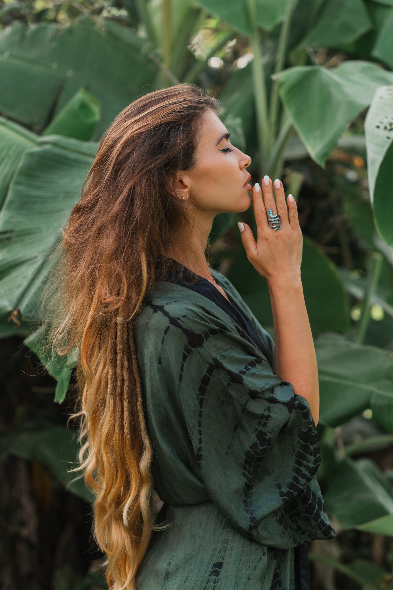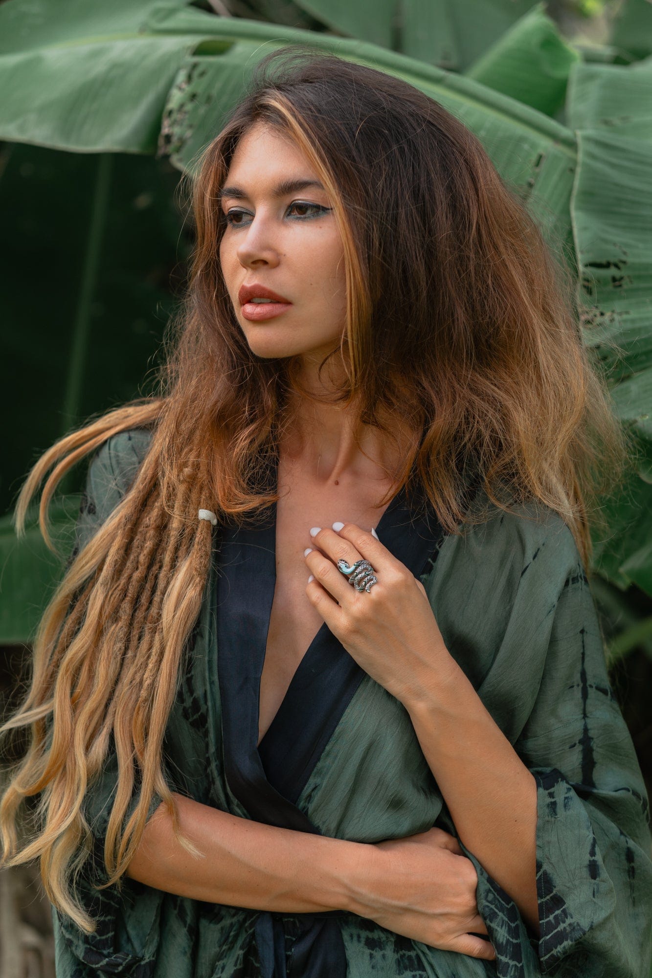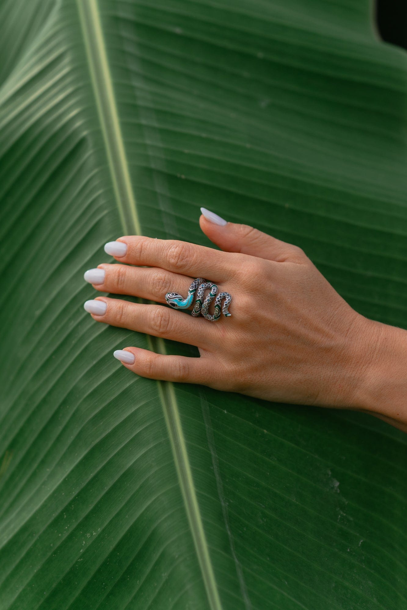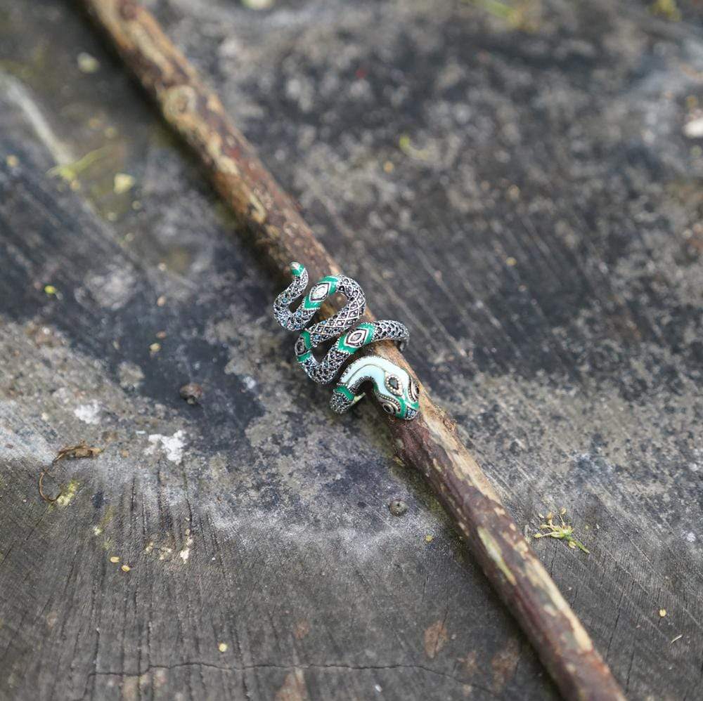 About: The myth of the jungle. transformed into a richly decorated statement jewelry item: Filigree stones set by hand and applied cold enamel enhance the intense effect of the fascinating snake ring in an interplay of green and turquoise.