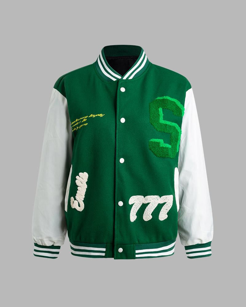 Details: Green baseball jacket with letter embroidery