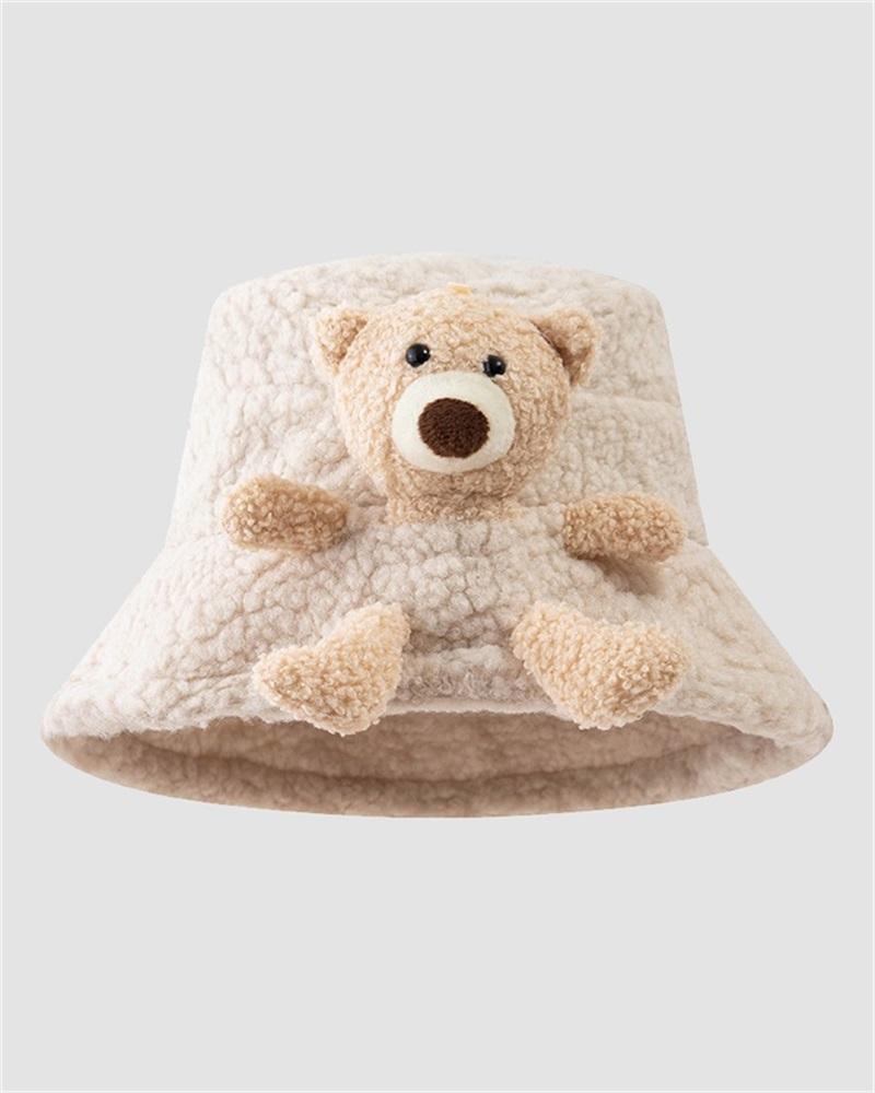 Details: Fuzzy bucket hat with teddy bear design