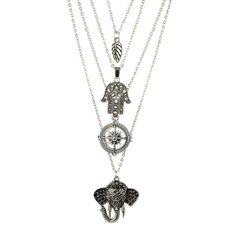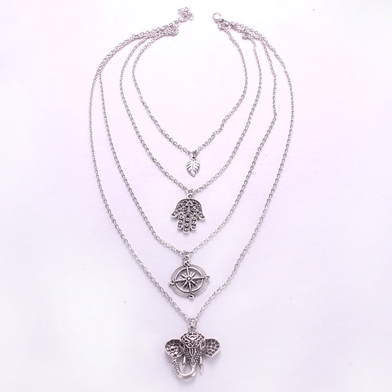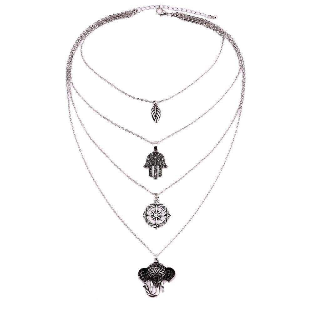 About: The Karma Necklace by Viho Shop. This four layer necklace includes all four pendants featuring leaf. hand. compass and elephant charms. Guaranteed to add positive vibes to any outfit.