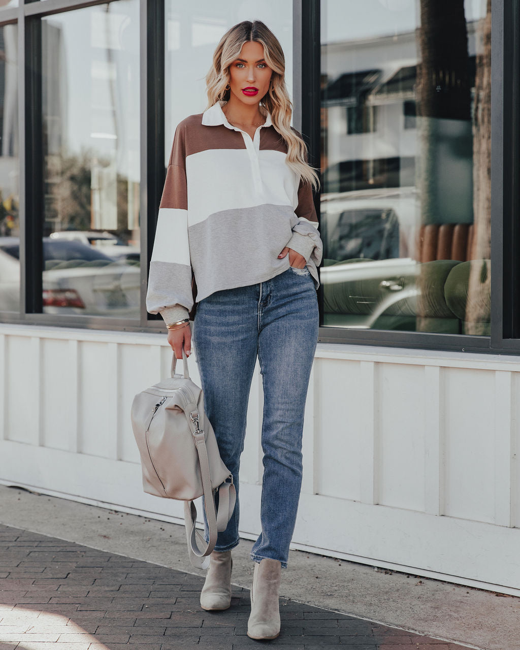 Look sporty chic in our Tobias Cotton Blend Rugby Top! This brown. white. and heather grey colorblock top is crafted with front henley buttons. Designed with a collar and side slits. Styled with the Tahiti Hoops. Aria Choker Necklace. Simple Bangle Bracelet. Kenzie Backpack. Benji High Rise Slim Straight Denim. and Uptown Faux Suede Heeled Bootie.