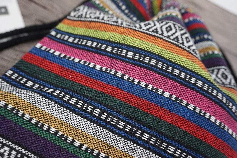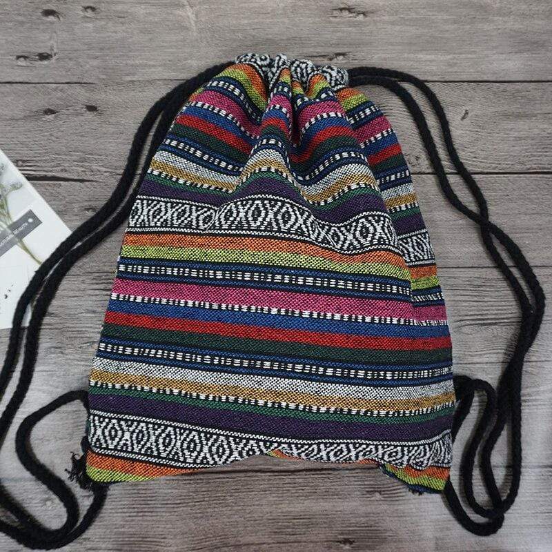 About: Embroidered drawstring bag featuring a geometric pattern with classic summer-time Boho Hippie style. Excellent for day-outings. casual use. and music festivals.