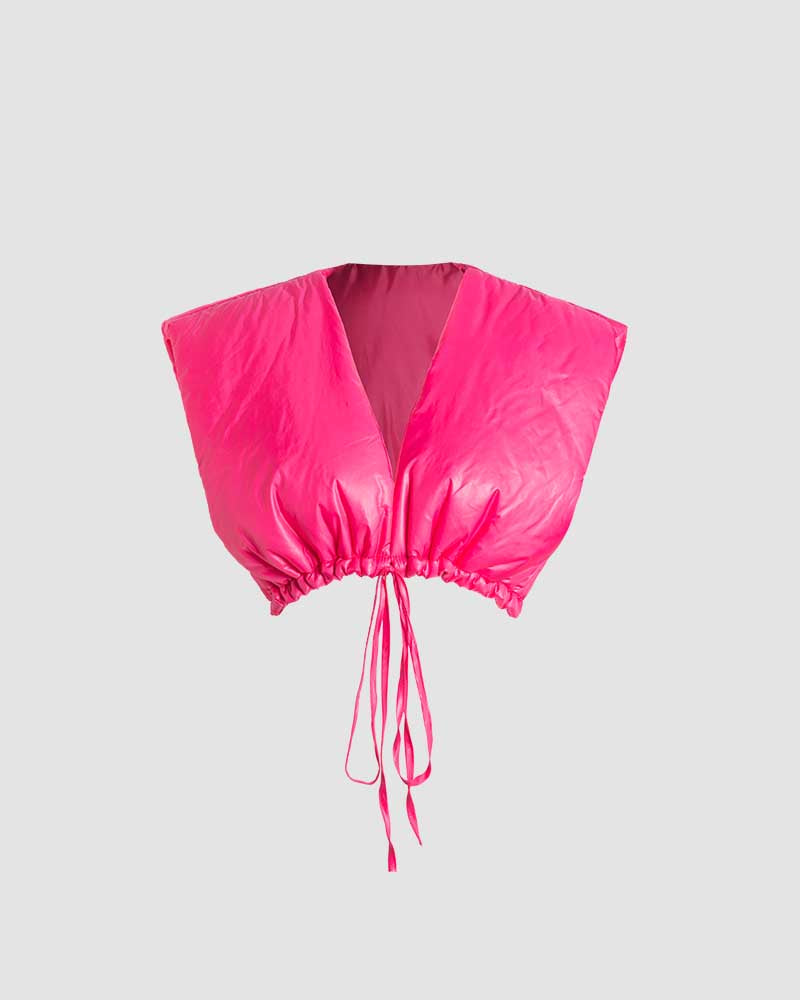 Details: Sleeveless puffer vest with front ribbon design