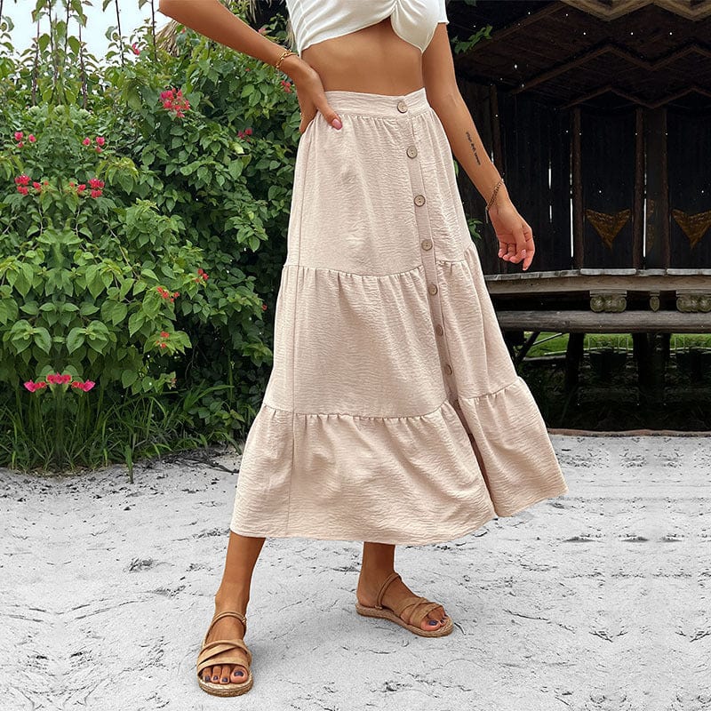 Show off your warm weather style with our Valeria Midi Skirt! Constructed from lightweight polyester. this high-rise skirt features tiers and a button closure for a look that's ready to conquer the summer. Get ready to turn heads when you hit the town!
