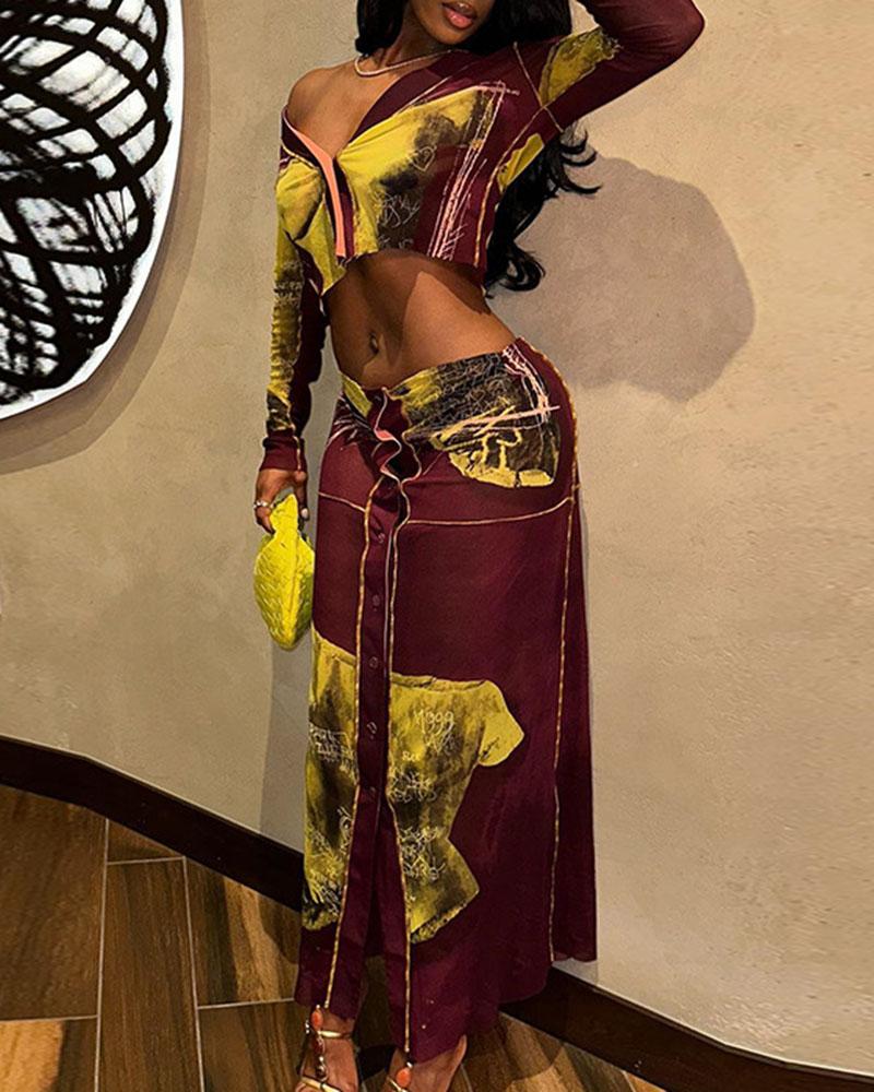 Details: Coord set with vintage graphical print. coming with long-sleeve top and maxi skirt