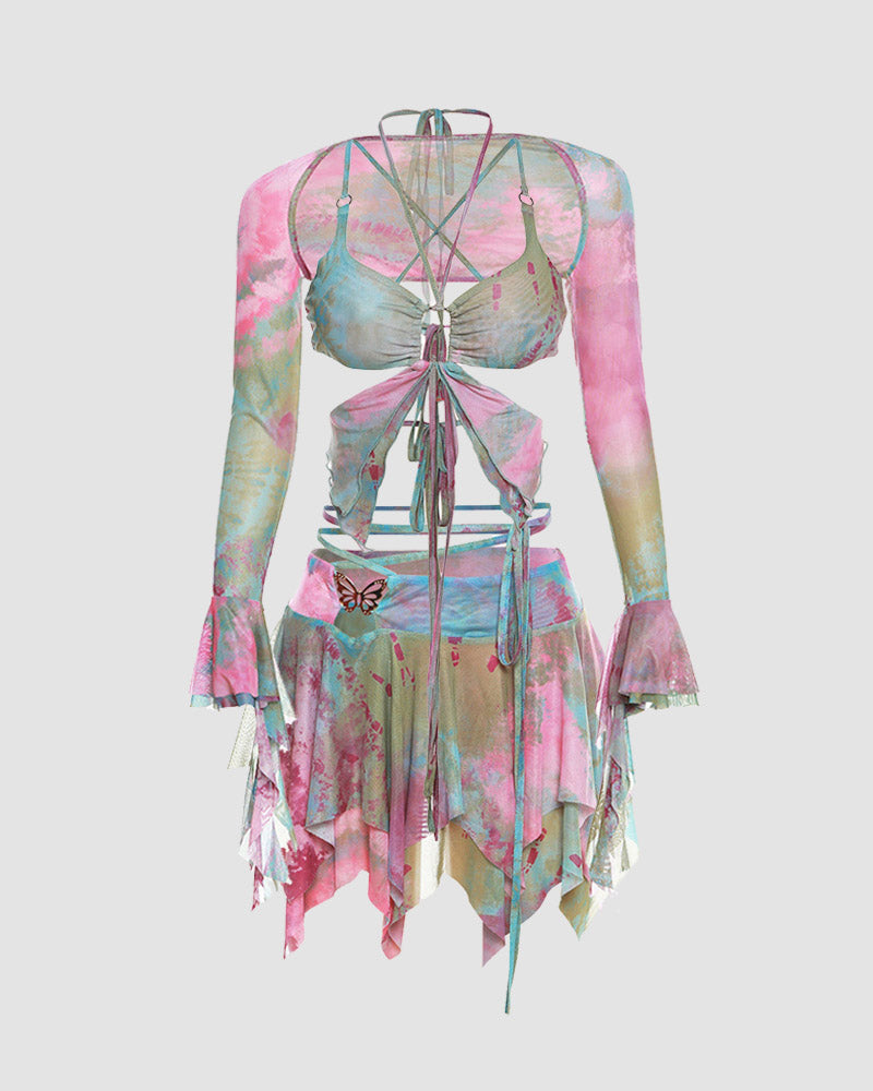 Details: Watermarbled coord set. coming with a pair of sleeves. butterfly bralet top and short skirt