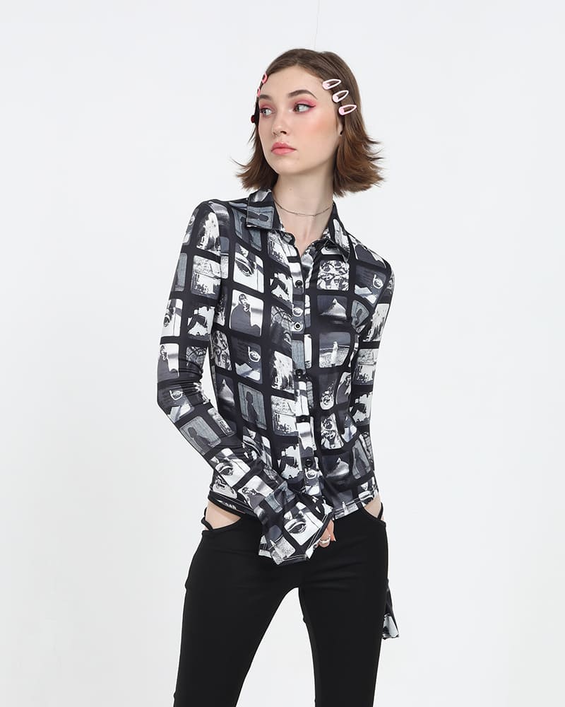 Details: Long-sleeve shirt with black & white film image print