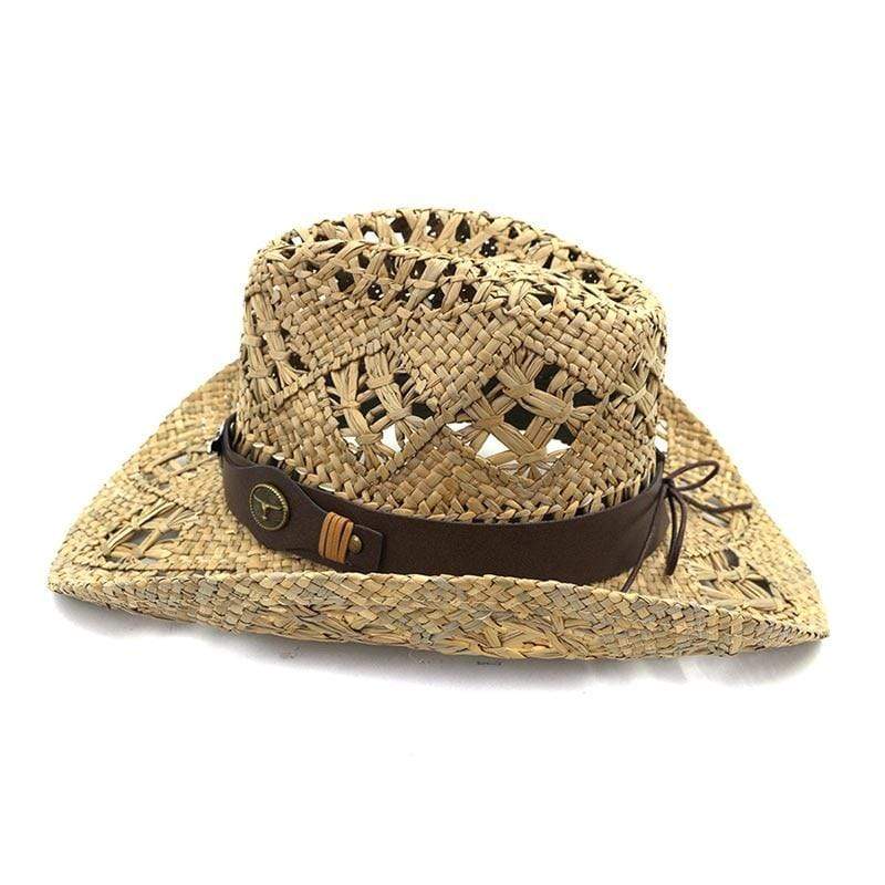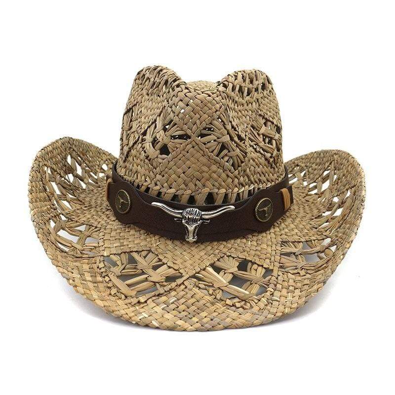 About: Experience the outdoors and travels like never before with our Western Straw Cowboy Hat. With its characteristically curved brim. a decorative band made from imitation leather and a bull head on the head section. this Western hat made from light straw has a stylishly authentic North American look.